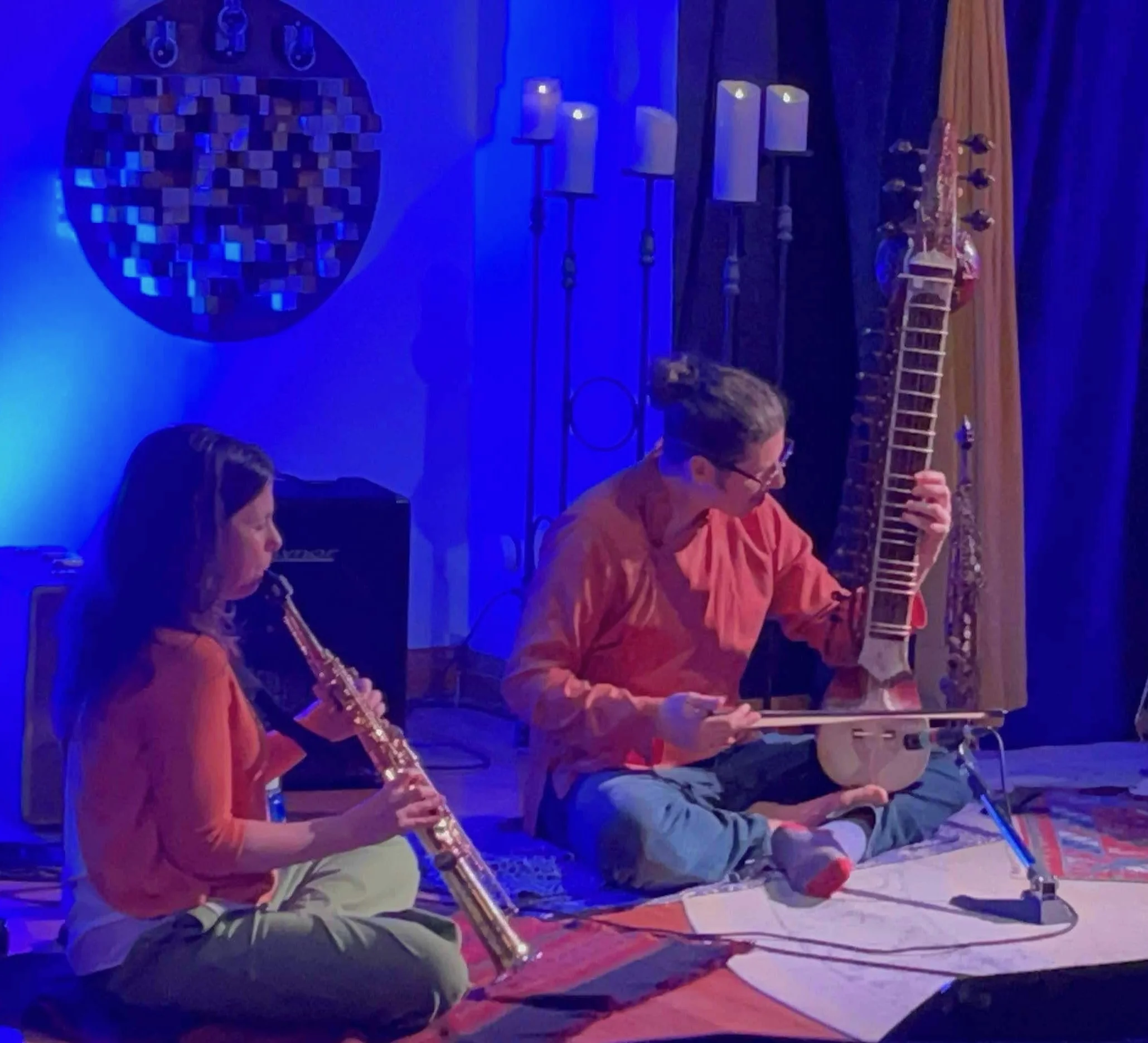 Their arsenal is vast and unruly; exploring double soprano; or pairing soprano with; its larger sibling tenor saxophone; or with esraj (the haunting 21-stringed Indian relic), shakuhachi, customized Tibetan horn, or electronics based upon just-intonation. These instruments become more than tools; they morph into conduits for celestial resonance and primal feedback loops that defy earthly expectation. The duo’s unconventional technique of coupling of saxophones generates a dizzying, otherworldly soundscape that shatters traditional expectations based upon the separation of music from noise. Their lived experiences in non-Western musical and spiritual traditions are the molten core of their work—infusing their sonic explorations with a contemplative intensity, forging a sound-world where the sacred and the rebellious converge in a nomadic and participatory sound-ritual.